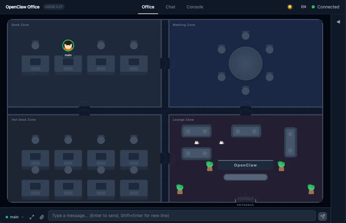 2Dオフィスビュー | エージェントがバーチャルオフィス内で動き回るリアルタイム表示 |