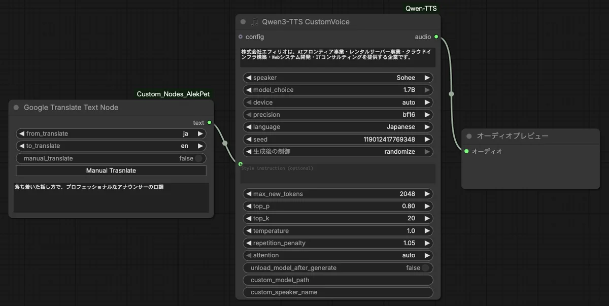 ワークフローはこんな感じ(念のため、AlekPetの翻訳ノードを入れています)