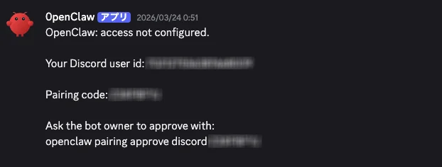 BotがDiscordに接続できたら、次はペアリングです。BotにDMを送ると、ペアリングリクエストが発生します。